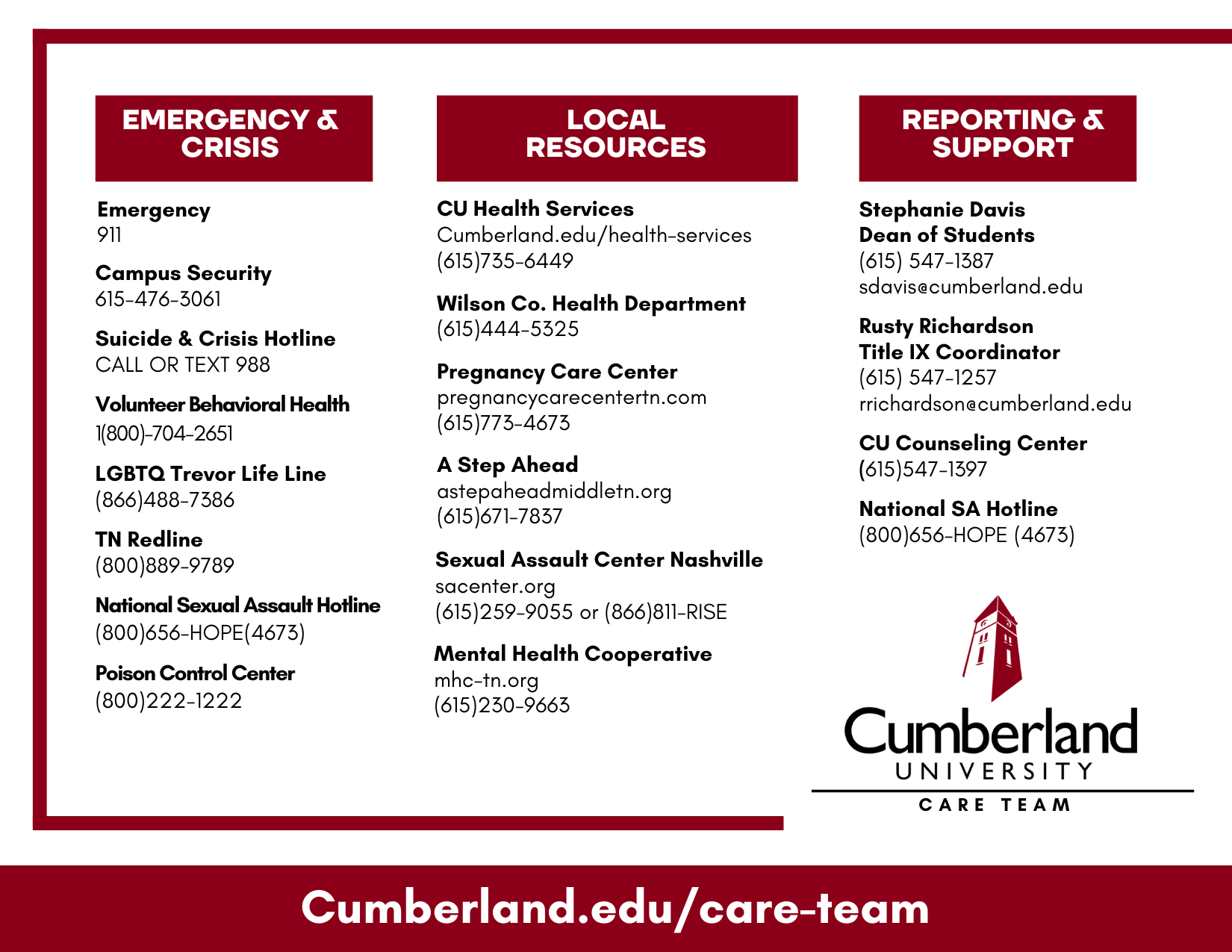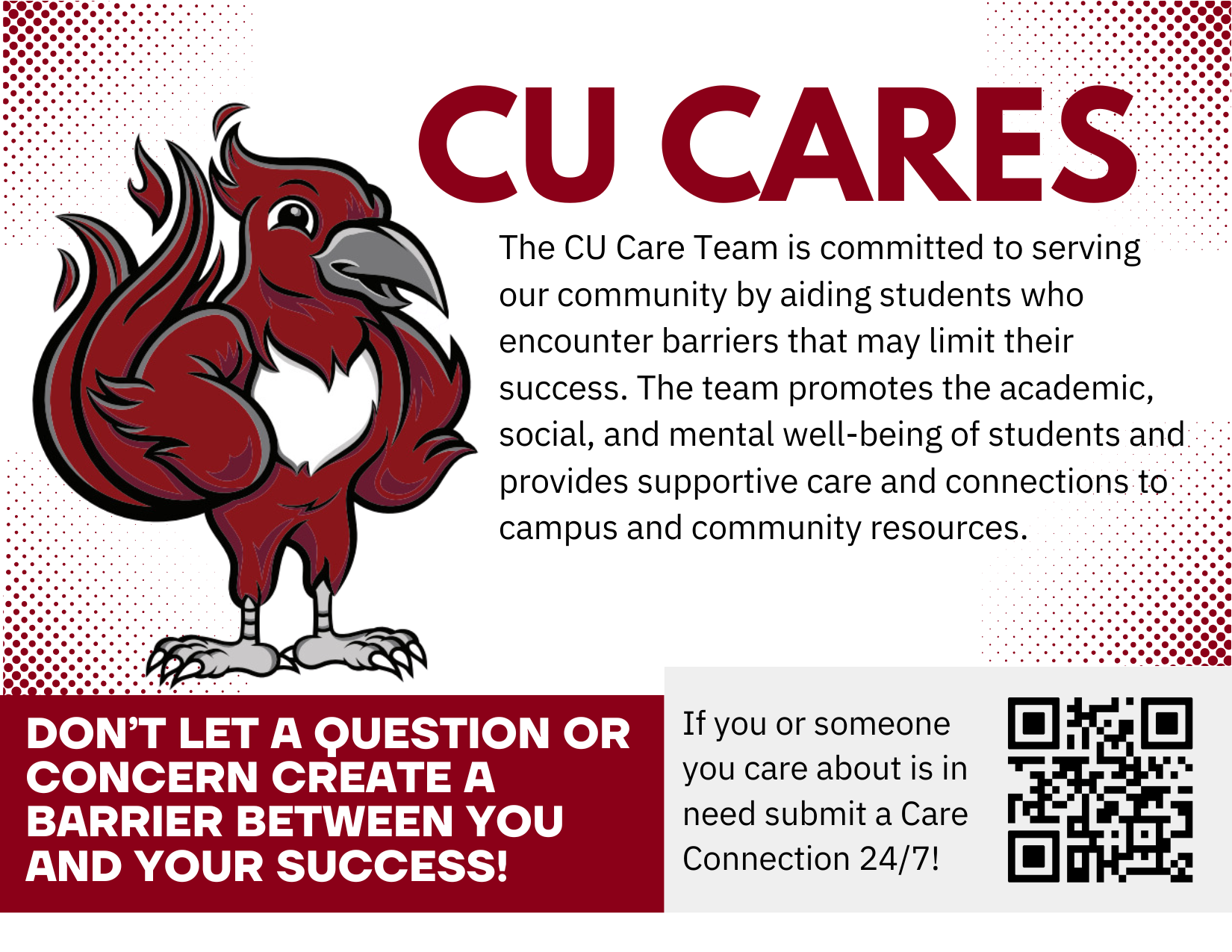 The CU Care Team is committed to serving our community by aiding students who encounter barriers that may limit their success. The team promotes the academic, social, and mental well-being of students and provides supportive care and connections to campus and community resources.